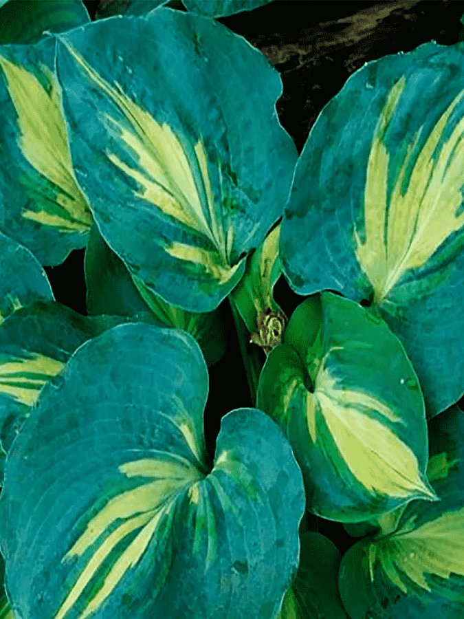 - плотные, складчатые листья имеют интенсивно-синюю окраску с желто-кремовым центром;