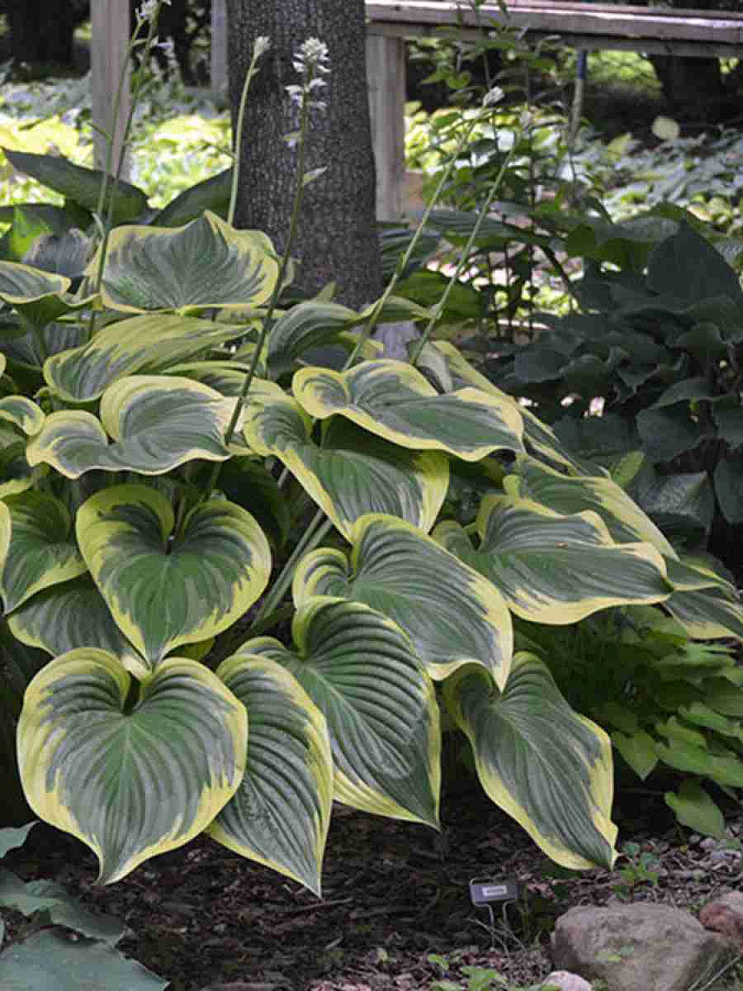 Хоста гибридная финал виктори - это удивительное растение с травянистым стеблем, достигающим высоты до 100 см. Ее листья зеленые с небольшим желтоватым оттенком, края широкие и кремовые, создавая неповторимый вид. Цветет в июле и августе, радуя глаз своими зелеными цветами. Она идеально подходит для групповых посадок, миксбордеров или одиночных посадок.