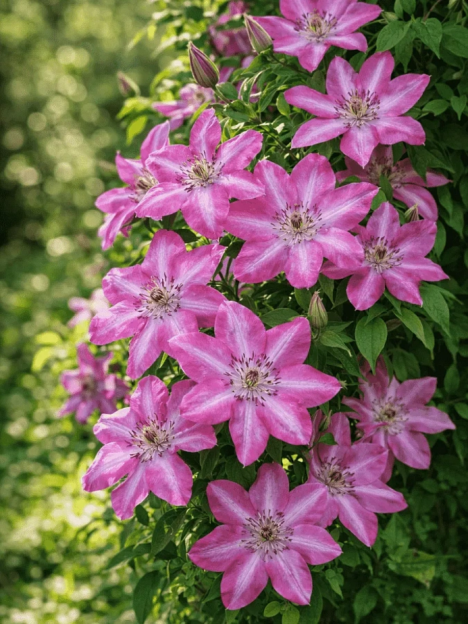 Саженцы клематиса гибридного Бешчады (Bieszczady) предпочитают хорошо освещенные, защищённые от ветра и сквозняков места. Для выращивания подходит плодородная супесчаная или суглинистая рыхлая почва. Цветет длительно и обильно с июня до сентября. Цветки диаметром 14-20 см, розовые со светлой полосой посередине лепестка. Высота растения достигает 200-300 см, для полноценного развития саженцам нужна опора. Клематис гибридный Бешчады (Bieszczady) высаживают рядом с ограждениями, беседками, решётками и другими садовыми опорами.