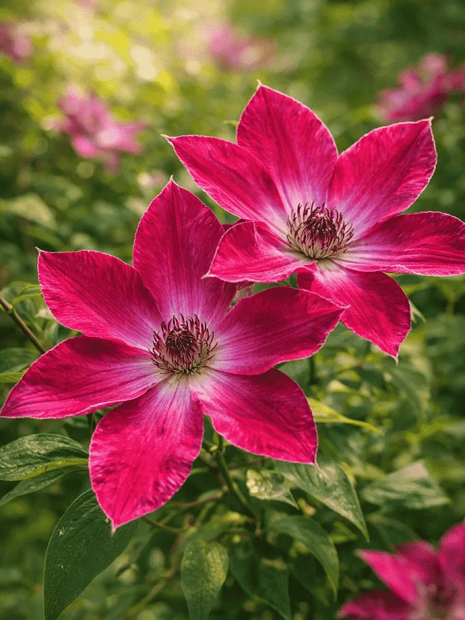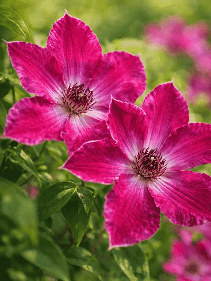 Клематис гибридный carmencita - это великолепное растение с карминно-красными и розовыми цветками, которые привлекают внимание своей красотой. Этот сорт клематиса отличается высотой до 250-300 см, что делает его идеальным для групповых или одиночных посадок в саду. Листья клематиса carmencita имеют уникальную форму и ярко-зеленый цвет, что придает растению особый шарм.