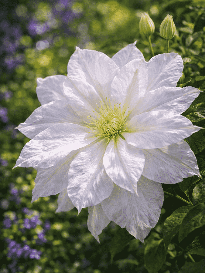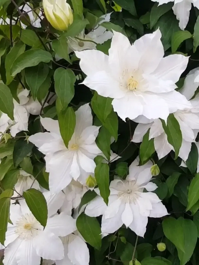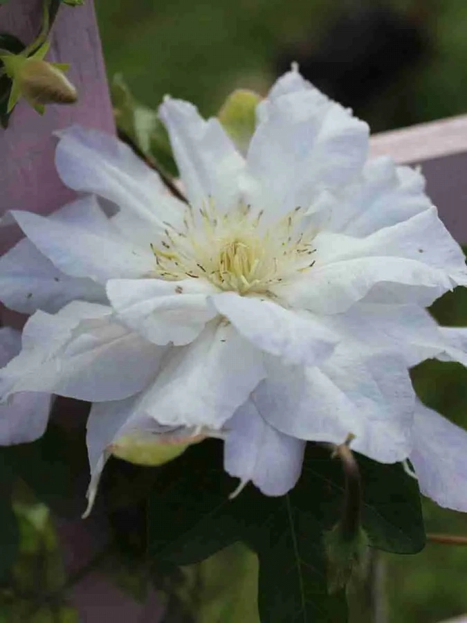 Саженцы клематиса гибридного Халина Нолл (Halina Noll) предпочитают солнечные открытые места. Почва должны быть плодородной, супесчаная или суглинистая с нейтральной или слабощелочной реакцией среды. Цветки клематиса гибридного Халина Нолл (Halina Noll) достигают 18 см в диаметре, белые с легким розовым оттенком и светло-зеленой полосой в центре каждого лепестка. Цветки на побегах прошлого года махровые, на побегах текущего года – простые. Цвет с мая по август. Декоративная лиана оплетает любые опоры, например кустарники, хвойные и лиственные деревья, а так же беседки, заборы и другие садовые конструкции.
