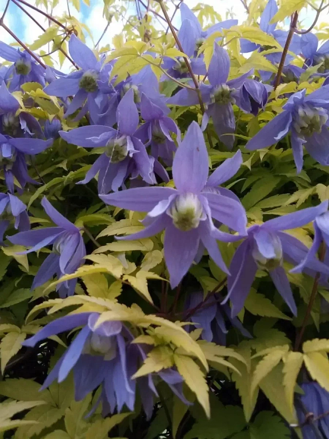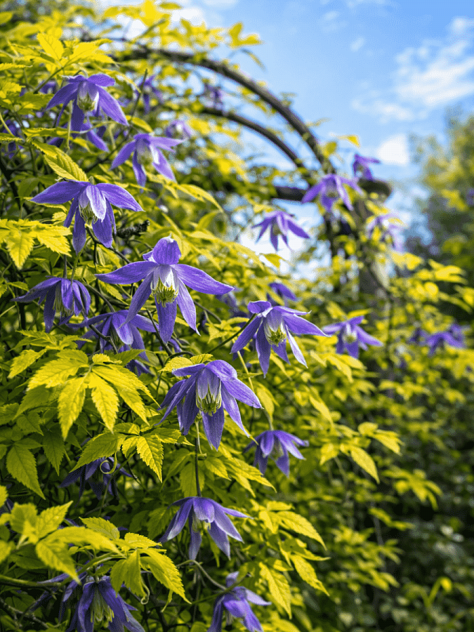 Саженцы клематиса гибридного Столвик Голд (Stolwijk Gold) высаживают на солнечные или полузатененные участки с влажной, плодородной почвой. Взрослое растение достигает в высоту 200-300 см, при помощи листовых черешков цепляется за поверхность, расположенных рядом объектов. При отсутствии опоры побеги стелются по поверхности почвы. Клематис гибридный Столвик Голд (Stolwijk Gold) не теряет декоративных качеств в течение всего сезона, благодаря золотисто-желтой листве, которая контрастно сочетается с фиолетово-голубыми цветками и светлыми пушистыми соплодиями. Цветки в диаметре достигают 5-6 см, широко раскрытые по форме напоминают колокольчик. Цветет обильно, начиная с конца апреля и на протяжении мая. В течение лета цветение повторяется.
