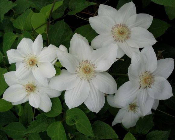 Листья клематиса зеленые, что придает растению свежий и яркий вид. Для процветания "Джорджа Джекмена" выберите солнечное или полутенистое место в саду. Растение предпочитает плодородные почвы и требует умеренного полива и опрыскивания. Важно обрезать побеги до 20 см для поддержания здоровья и красоты растения.