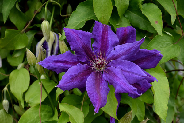 Клематис крупноцветковый "Вайлдфаер" - это волшебное растение, способное преобразить ваш сад в настоящий рай для глаз. Его стволы прочные и изящные, достигают высоты до 200-300 см, создавая великолепный вертикальный акцент. Листья клематиса имеют уникальную форму и яркий зеленый оттенок, что делает его еще более привлекательным.