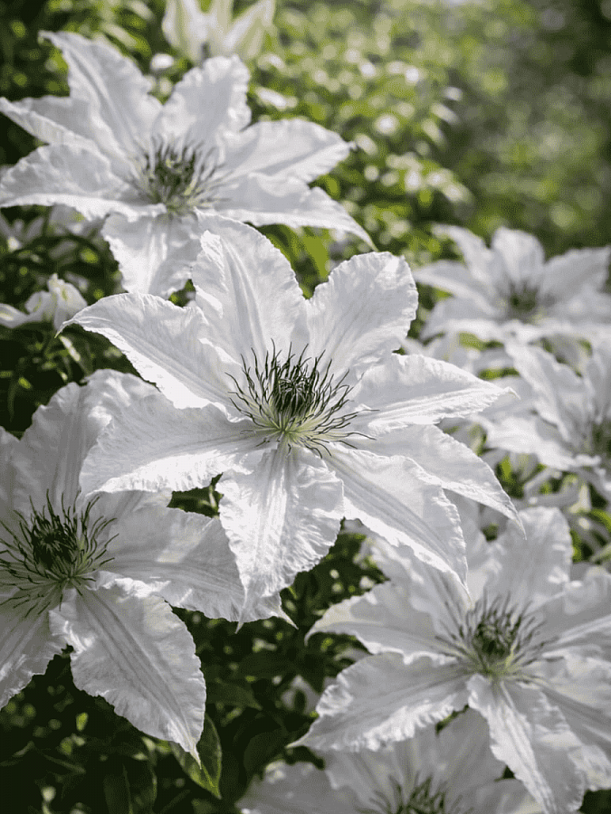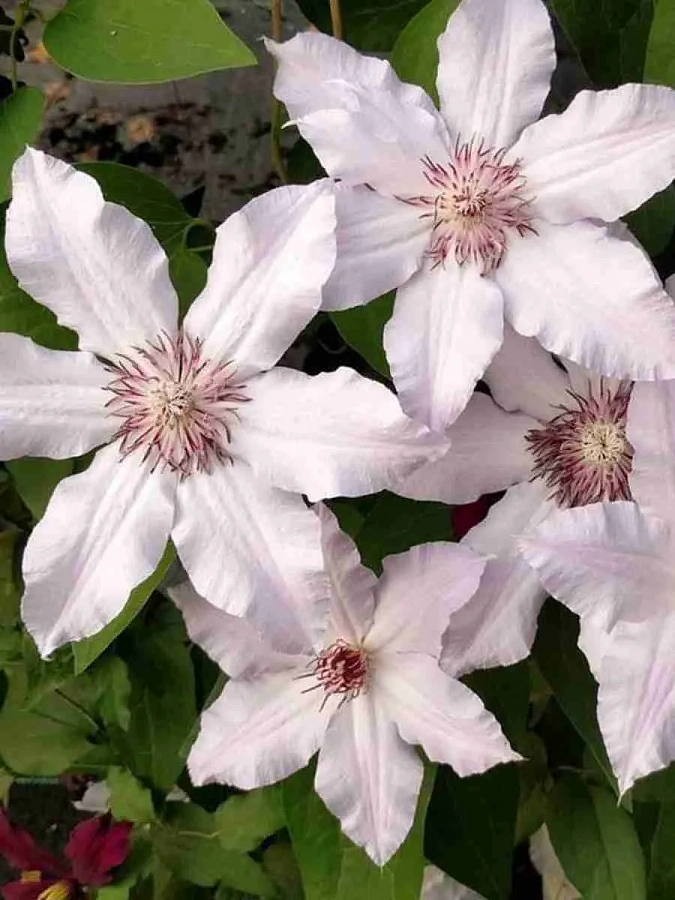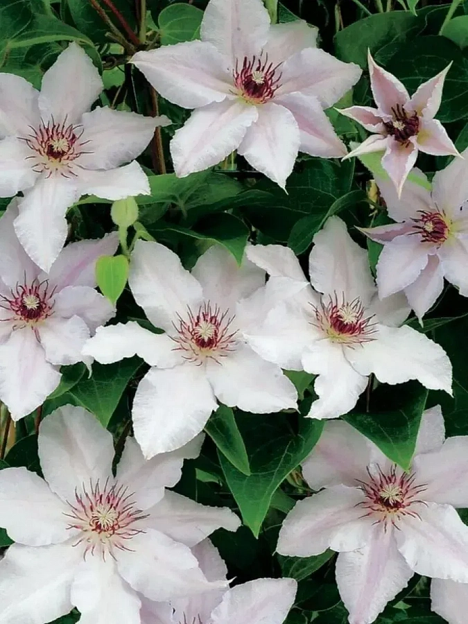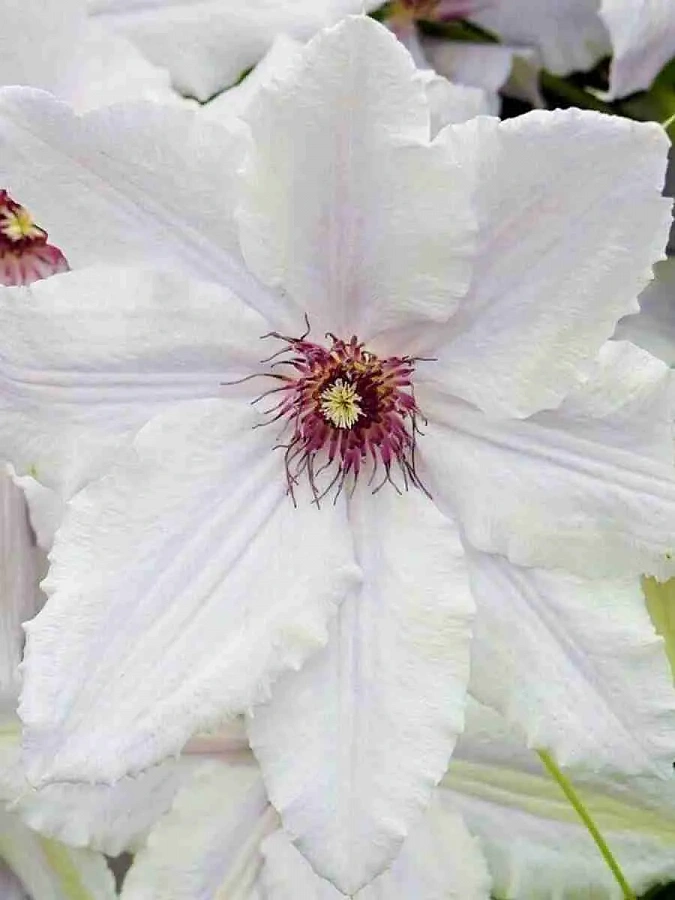 Клематис Сноу Квин представляет собой компактный куст с вьющимися лиановидными побегами длиной до 250-300 см. Сорт относится к группе Патенс (кустарниковые крупноцветковые лианы с 2 этапами цветения). Листья тройчатые, продолговато-вытянутые с острым кончиком. Листовая пластина гладкая, светло-зеленого цвета. Цветы одиночные крупные. Гофрированные лепестки белого цвета длиной до 10 см и шириной около 5 см расположены в один ряд вокруг сердцевины с крупными темно-красными тычинками. Внешне цветок напоминает гигантскую снежинку с перекрывающимися лепестками в количестве от 6 до 9 лучей.