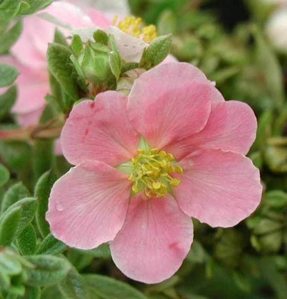 - у крупномера, посаженного в солнечном месте, крона густая и ажурная. Цветет этот сорт лапчатки с начала июня до середины октября. Ярко-зеленые листочки гармонично сочетаются с розовыми цветами. Сделать нежно-розовые цветы ярче и насыщенней поможет подкисление почвы и небольшая подкормка. Растению не страшны садовые вредители и сильные холода.