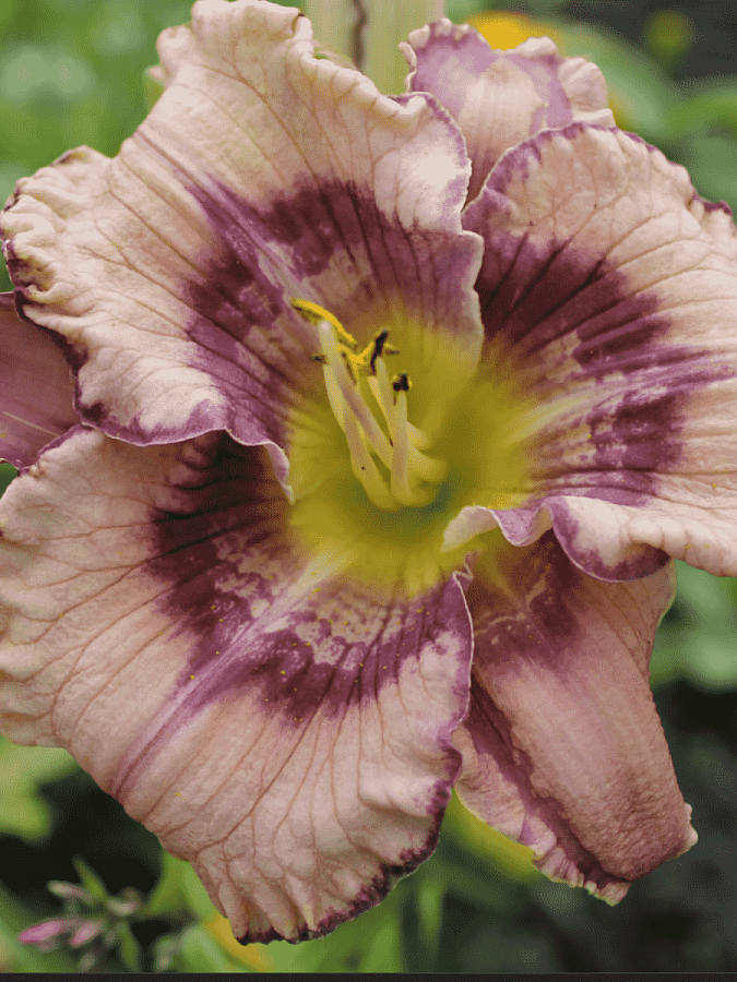 Окраска цветка : Кремовая с ярким фиолетовым калейдоскопическим глазом, который имеет необычный полосатый рисунок (может быть до 9 полос различного цвета)