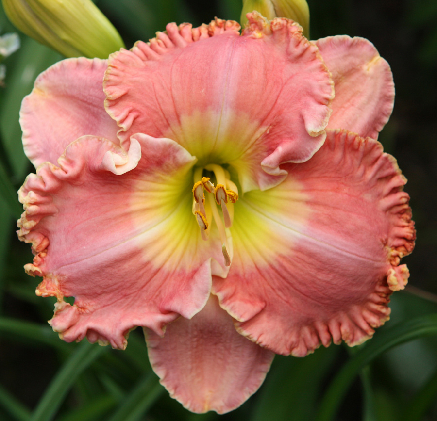 Окраска цветка : ярко-розовый с зелёным горлом и жёлтой гофрированной каймой