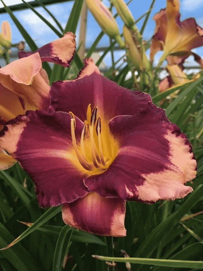 Лилейник гибридный Greyp Sherbet - это уникальное растение с фиолетовыми цветками и лососево-розовыми краями, которое поразит ваш сад своей красотой. Этот лилейник достигает высоты до 60 см и цветет в июле-августе, радуя глаз своими яркими оттенками. Его зеленая листва создает прекрасный контраст с цветами, делая его идеальным для газонов, групповых посадок и миксбордеров.