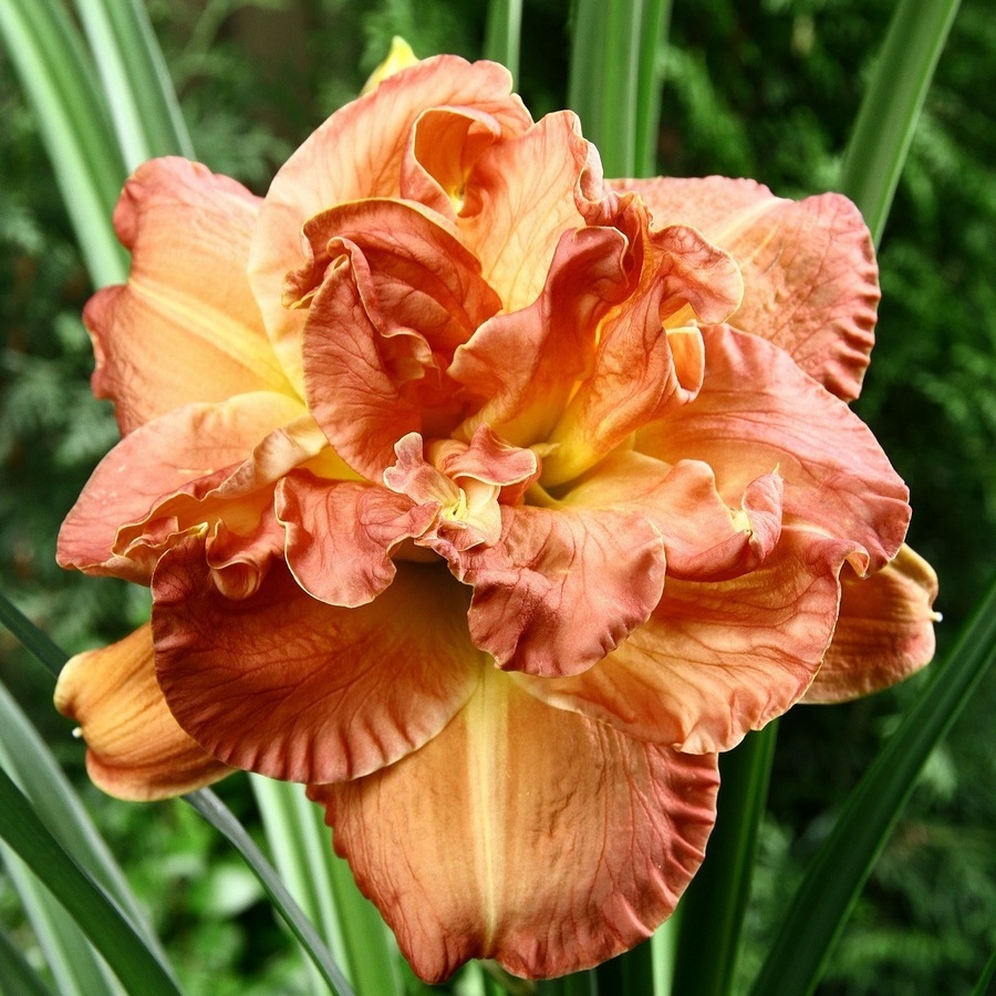 Окраска цветка : сильномахровый, бронзовый, с желтой полосой по центру лепестка