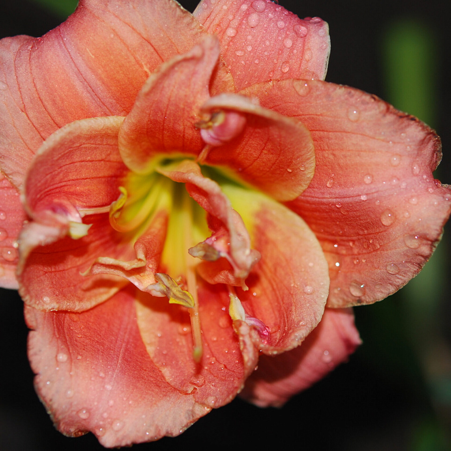 Окраска цветка : лососевый с красным глазком и жёлтым горлом