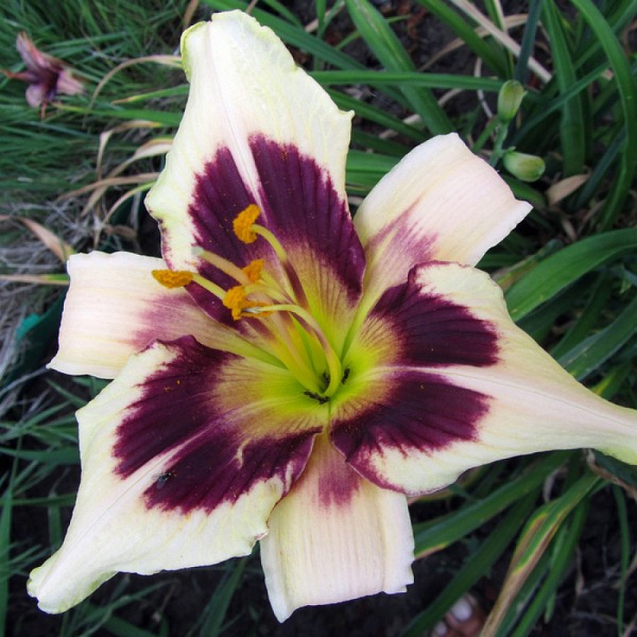Окраска цветка : белый с пурпурным глазком и зеленым горлом,повторное цветение