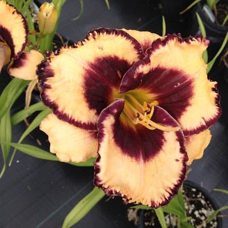 Рассада лилейника Мусака (Moussaka) выгодно смотрится в садах благодаря своему необычному цветку кремового цвета с фиолетовой сердцевиной и ярким горлышком лимонного оттенка. Цветки крупные до 15 см в диаметре. Ещё одна особенность – это окантовка красивого фиолетового цвета гофрированной текстуры. После середины июля растение начинает цвести и длится этот период около 2 месяцев, а при преобладании солнечной погоды – до самой осени. Несмотря на нормальное развитие в тени растение рекомендуется высаживать на солнечном месте – так удастся сохранить его декоративные свойства в полной мере.