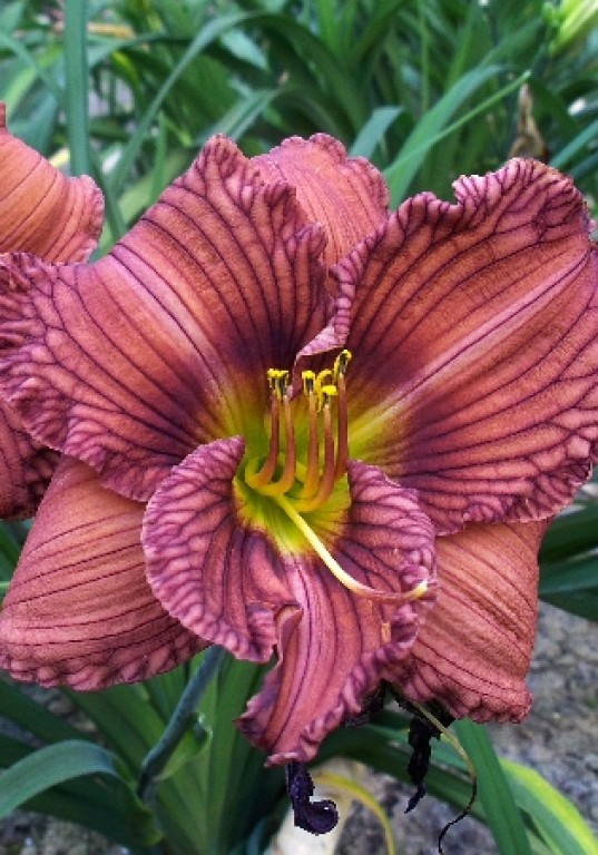 Окраска цветка : светло-коричневый с жёлто-зелёным горлом и фиолетовыми прожилками