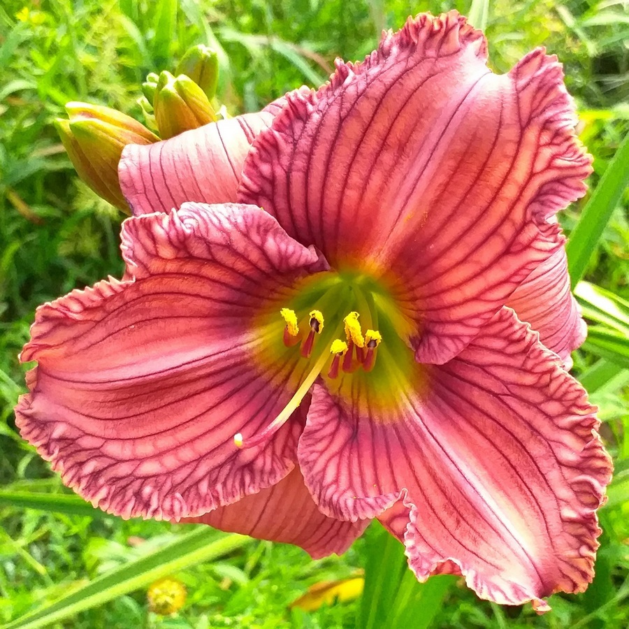 Цветок лилейника Новеа ту Хайд необычного розовато-коричневого оттенка с небольшим лимонным горлом и фиолетовым глазком. Вся поверхность гофрированных лепестков испещрена темно-фиолетовыми прожилками. Период обильного цветения приходится на июль, возможно повторение осенью.