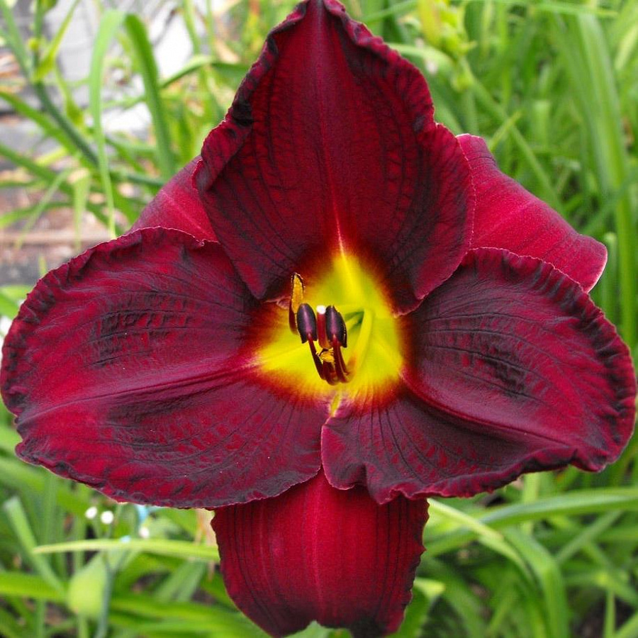 Цветок лилейника Пурпл Рейн имеет насыщенный вино-красный оттенок с более темными прожилками по поверхности лепестков. Особое очарование бутону придает зеленоватое горло, окруженное небольшим темно-пурпурным глазком. На одном стебельке обычно распускается сразу несколько бутонов.