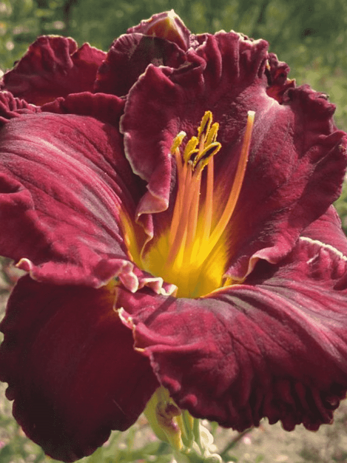 - невосприимчивость семян к бактериям. Цветущее растение представляет собой раскидистый куст с высокими цветоносами и крупными бутонами темно-фиолетового оттенка. Контраст темным лепесткам и практически черному глазку создает сочное лимонное горлышко. Лепестки имеют гофрированные края и тонкую кайму белого цвета. Первое цветение лилейника Пурплликоус можно наблюдать уже в июле месяце.