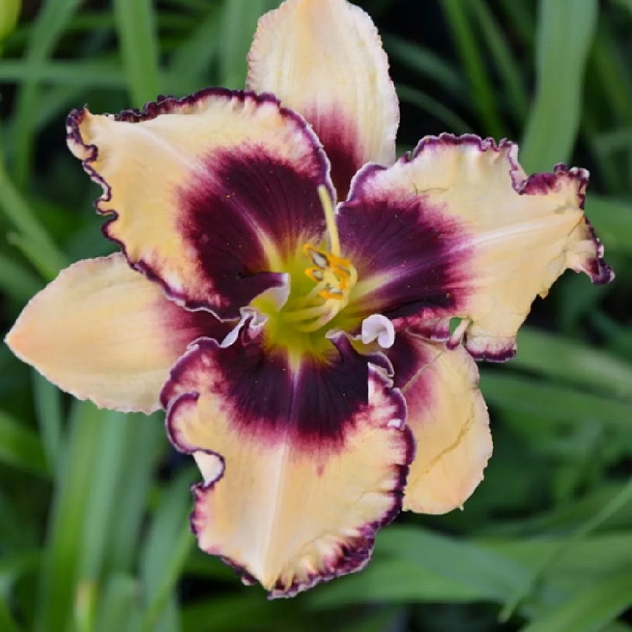 Окраска цветка : белый с тёмно-бордовым глазком и каймой, горло зелёное