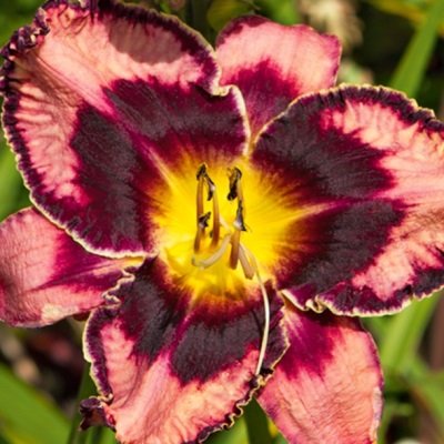 Окраска цветка : Розовая с пурпурным центром и жёлтым горлом