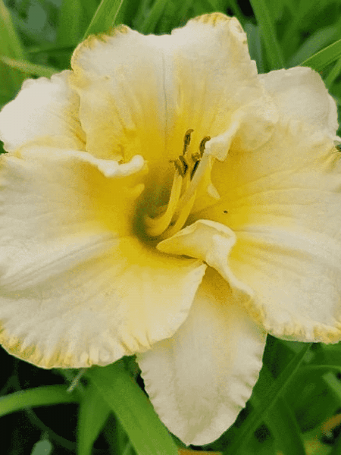 Цветок лилейника Вилла Ванилла переливчатый: цвет меняется от ванильного до лимонно-желтого. По краю лепестки имеют гофрированную золотистую окантовку. Горло бутона насыщенного лимонного цвета.