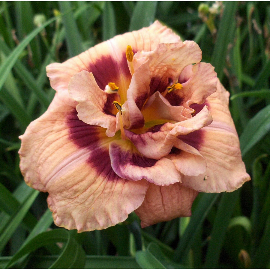 Окраска цветка : лососевый с пурпурным глазком и зелёным горлом