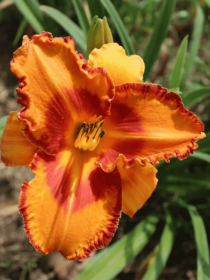 Окраска цветка : огненно-оранжевая с красным глазом, желто-зеленым горлом и гофрированной двойной красно-золотой каймой по краям внутренних лепестков