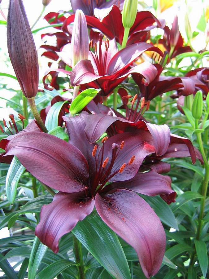 Лилии темно-фиолетового, винного цвета. Лепестки немного изогнуты, перламутровые. Пик цветения приходится на середину лета. Азиатский сорт неприхотлив в выращивании, не боится низких температур, не болеет. Хорошо себя чувствует на солнце и в полутени. Предпочитает нейтральные почвы.