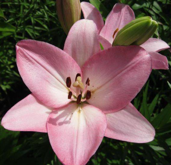 Окраска цветка : Перламутрово-розовая с белым центром, темно-розовые пыльники и редкий мелкий крап у основания