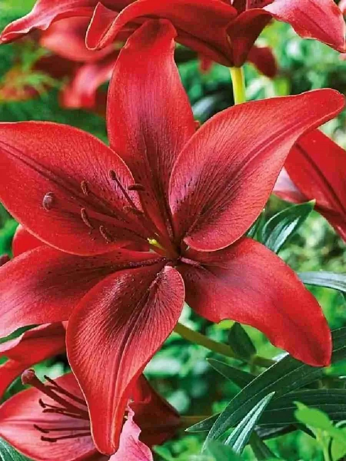 Луковицы Лилии ЛА-гибрид Коларес (Lilium LA-hybrids Colares) вырастут в гигантское растение, достигающее полутора метров в высоту. К выбору места для посадки нужно подходить осмысленно, высаживая лилию на заднем плане бордюров. Восхищения заслуживают направленные вверх цветки красно-кораллового цвета с редким крапом в центре. Лепестки слегка подкручены внутрь и имеют характерный глянцевый блеск. В контрасте с изумрудно-зелеными листьями лилия смотрится ещё роскошнее. Помимо впечатляющей красоты, Коларес источает сильный сладкий аромат. Каждое растение с множеством цветов на одном стебле ― это готовый букет на садовом участке.