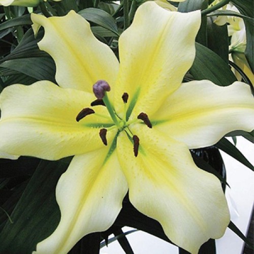 Лилия от-гибрид барута - это великолепное растение с яркими лимонно-жёлтыми цветками, украшенными жёлтой полосой и белой каймой. Ее стебель достигает высоты до 105 см, а размер цветка составляет 25 см. Листья лилии имеют интересную форму, что делает это растение еще более привлекательным.