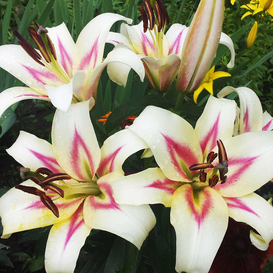 Лилия от-гибрид бонбини - это великолепное растение, которое поразит вас своей красотой и изысканностью. Ее стебель достигает высоты до 90-100 см, а цветки имеют размер впечатляющих 25 см. Лепестки белого цвета с бордовым оттенком создают неповторимый вид, а желто-зеленое горлышко придает цветку особую изюминку.