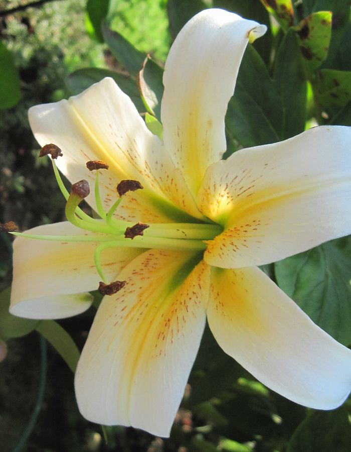 Окраска цветка : белый с желтыми мазками из центра, темно-оранжевыми мелкими штрихами и темными пыльниками