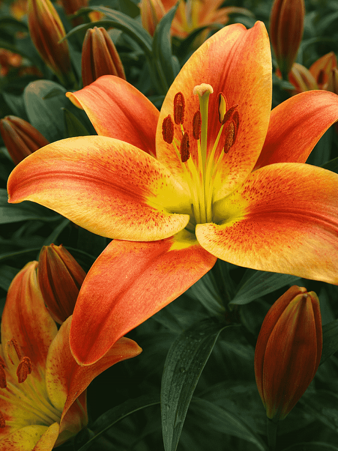Лилия от-гибрид Монтего-Бей - это великолепное растение, которое поразит вас своей красотой и изысканностью. Ее стебель достигает высоты до 160 см, а цветки жёлто-оранжевого цвета с красными мазками в центре радуют глаз размером до 25 см. Листья лилии имеют зеленую окраску и уникальную форму, что делает это растение еще более привлекательным.