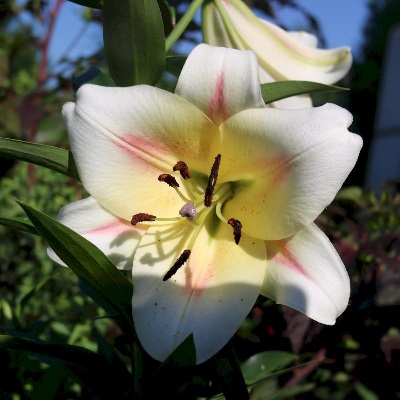 Окраска цветка : белый с желтоватым центром, со светло-малиновыми продольными мазками по центру лепестков и темными пыльниками