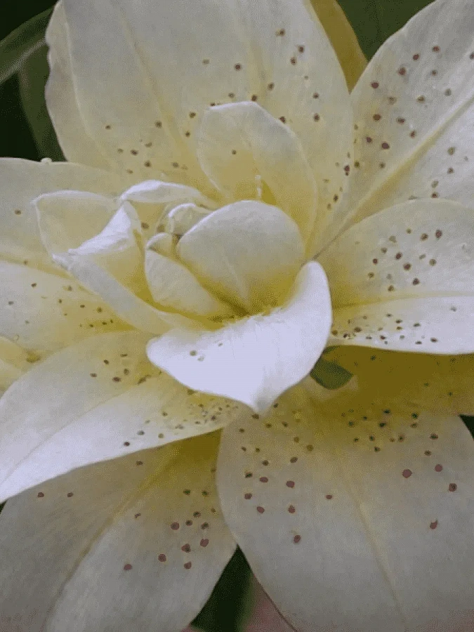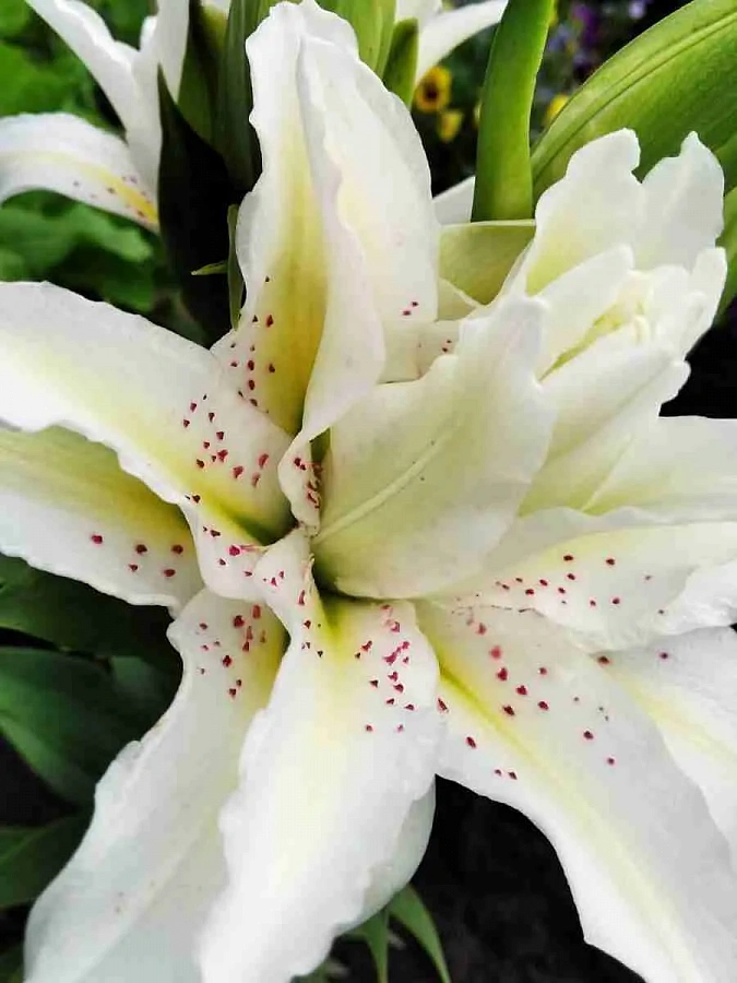 Окраска цветка : белая с желтым центром и бордовым крапом