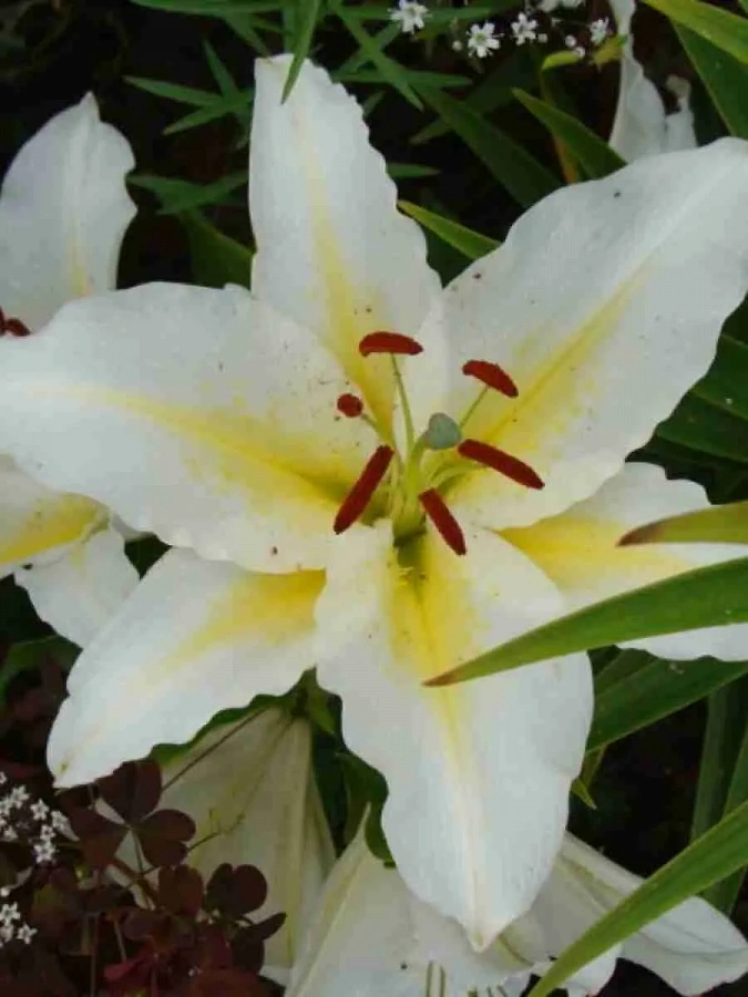 Луковицы лилии восточной Бафферари (Lilium oriental Bafferari) — очень изящный и нарядный сорт, подойдет любителям контрастов и насыщенных оттенков. Он популярен благодаря особенно крупным цветам (до 25 см в диаметре). Лепестки широкие, с ярко-желтым центром и белыми краями — между этими оттенками нет плавного перехода. Пыльники темно-бордовые, создают дополнительный контраст. При грамотном уходе лилии могут расти в открытом грунте до 5 лет без пересадки. Взрослое растение достигает 110–120 см, отличается мощным стеблем и высокой устойчивостью к перепадам температур и вредителям. Если на зиму срезать стебли и накрыть луковицы, за них можно не переживать даже при заморозках до –35 градусов.