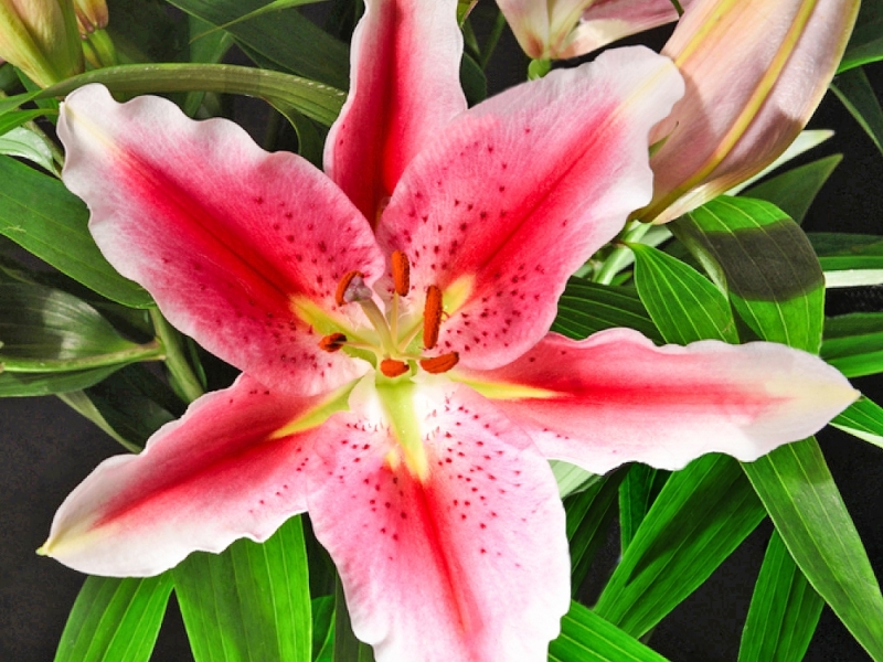 Луковицы лилии восточной горшечной Старлайт Экспресс (Lilium oriental Starlight Express) — стильное решение для украшения сада и выращивания в горшках. Кусты не отличаются крупными размерами и вырастают до 55 см в высоту, но они очень пышные. В конце лета начинают распускаться бутоны в большом количестве и практически полностью закрывают собой зелень. Цветы достигают 19 см в диаметре, очень ароматные. Они ярко-розовые с волнистой белой каймой и плавным градиентом к темно-бордовому центру. Лилия Старлайт Экспресс проста в уходе. Если ее поливать, подкармливать минеральными смесями и укрывать на зиму, она стойко переносит перепады температур и может оставаться на зиму в открытом грунте. Благодаря небольшому размеру сорт также выращивают в качестве домашнего растения в горшках.
