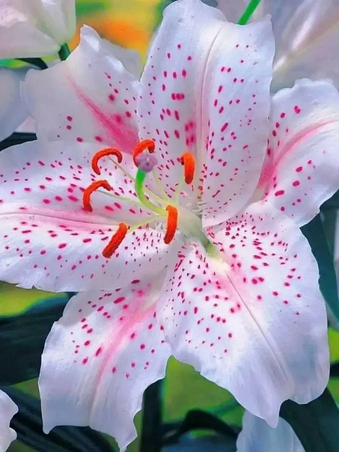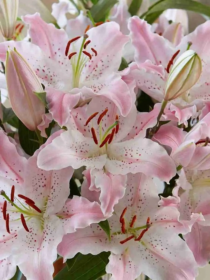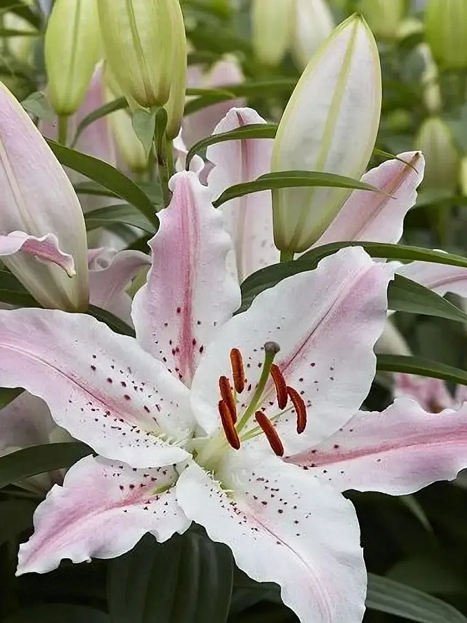 Луковицы лилии восточной Мускадет (Muscadet) вырастают в высокие прочные растения с шикарными белыми соцветиями из атласных лепестков. Цветение сопровождается приятным ароматом. Гофрированные лепестки покрыты малиновыми веснушками и бледно-розовыми внутренними полосками. Стройные стебли усеяны изящными зелеными листьями.