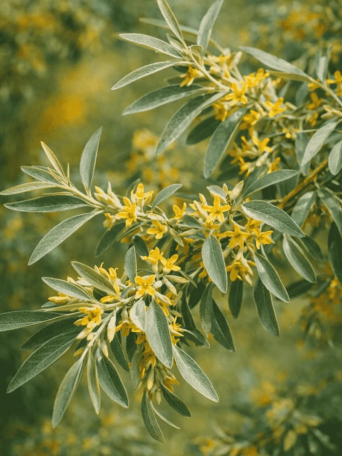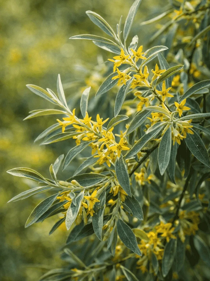 Саженцы лоха Элегнус Ангустифолия (Elaeagnus angustifolia) – вырастают в небольшие живописные деревца до 3-7 метров в росте. Каждое усыпано листвой, похожей на лавровый лист. Окраска листьев сверху серо-зеленая, нижняя часть – белого цвета, издали крона кажется серебристой. Цветет лох почти месяц мелкими цветочками серебристо оранжевого цвета очень ароматными. Период цветения – июнь. В августе–сентябре созревают съедобные плоды оранжево – красного цвета, круглые с косточкой, сладкие.