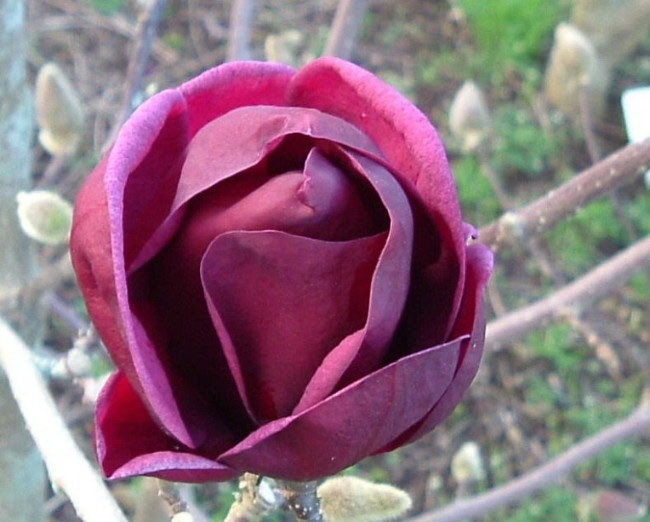 Бутоны имеют черно-красный цвет и напоминают по форме тюльпаны. Постепенно раскрывая лепестки, цветы достигают 15 сантиметров в диаметре. Этот вид магнолии хорошо подойдёт для маленьких садов, но отлично будут смотреться и на большой площади.