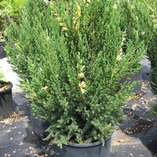 - цвет хвои неоднородный, на зеленовато-голубых ветках имеются кремовые пятна. Саженцы китайского можжевельника Стрикта Вариегата весьма неприхотливы и обладают устойчивостью к морозу и засухе.