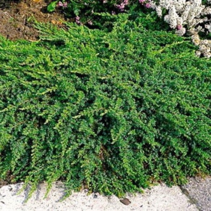 Саженцы можжевельника обыкновенного Гринмантл (Greenmantle) – этот вид из стелющихся почвопокровных сортов является особенно красивым. Медленнорастущий кустарник-карлик достигает высоты всего лишь 10 см за десять лет жизни. Крупномеры имеют широкую и плотную крону.
