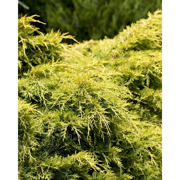 Саженцы можжевельника Пфитцериана Голден Сауке (Golden Saucer), который относится к стелющимся сортам этого растения, хорошо приживаются. С возрастом концы побегов немного приподнимаются, образуя характерную крону-блюдце. В период роста хвоя имеет светло-зеленый оттенок с золотыми переливами.