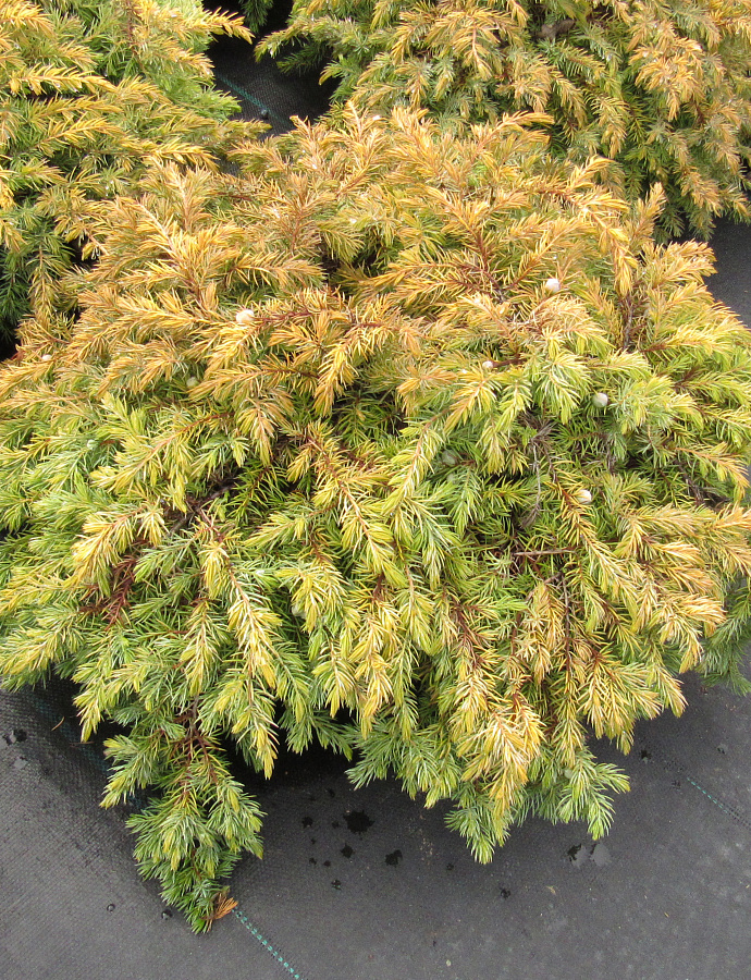 Саженцы можжевельника прибрежного Олл Голд (All gold) отлично подойдут для различных контрастных композиций, укрепления склонов и подавления сорняков. Высота растения — до 20 см, диаметр — 1-2 м. Хвоя жёлто-зелёная, молодые побеги — золотисто-жёлтые, долго сохраняют этот цвет. Морозоустойчивость -26 °C и больше. Этот сорт предпочитает хорошо дренированные и умеренно влажные почвы, но выживает практически на любых. Теневынослив, но при отсутствии прямого солнца теряет свой декоративный окрас. Возможно контейнерное содержание и высадка можжевельника Олл Голд в форме крупномеров.