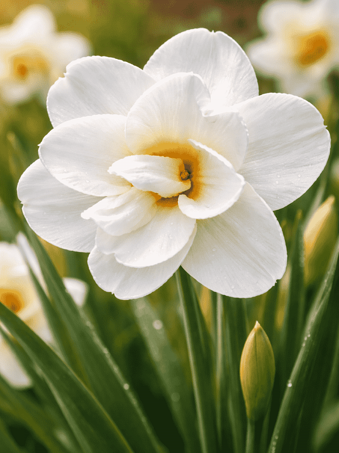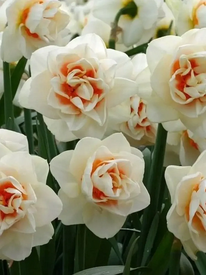 Нарцисс Acropolis - это изысканное растение с белыми цветками и ярко-оранжевым центром, которое поражает своей красотой и изяществом. Этот нарцисс достигает высоты до 50 см и цветет в мае-апреле, радуя глаз своими прекрасными цветами длительное время. Листья нарцисса Acropolis имеют форму луковицы и создают уникальный ансамбль с его цветками.