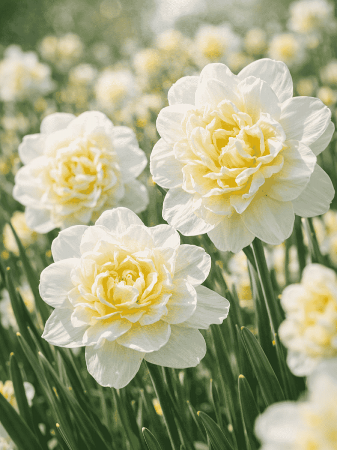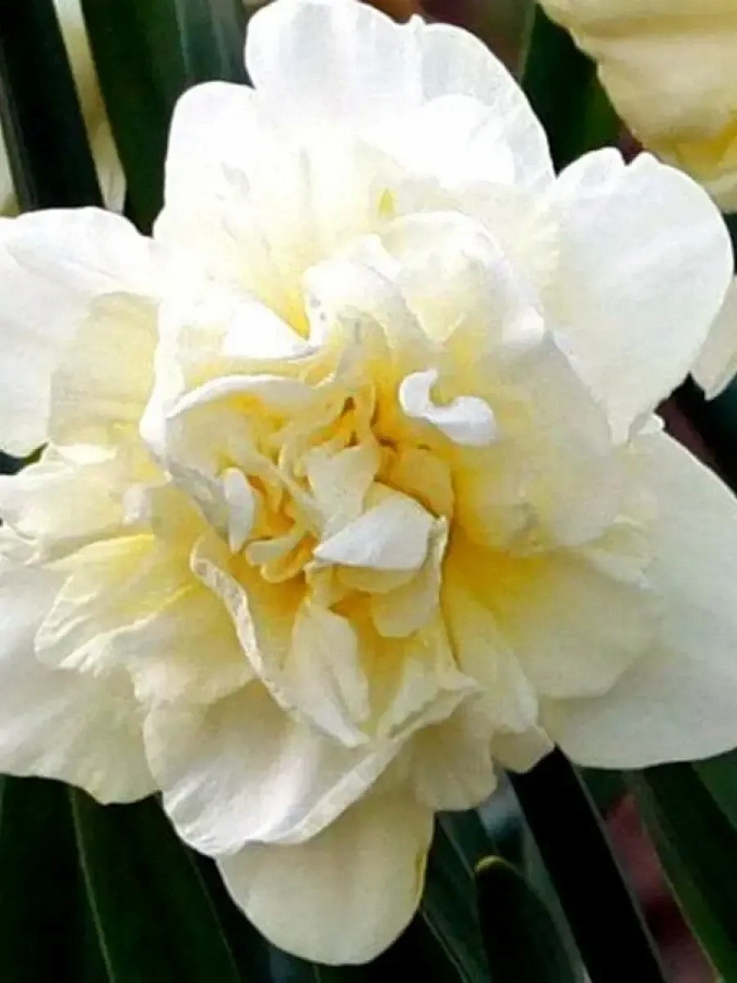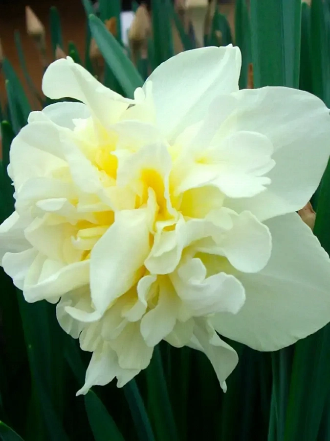 Листья нарцисса махрового обдэм имеют зеленую окраску и создают красивый контраст с белоснежными цветами. Растение предпочитает солнечные участки с полутенью и дренированные богатые почвы. Для его процветания рекомендуется умеренный полив и опрыскивание, а также регулярное удобрение.