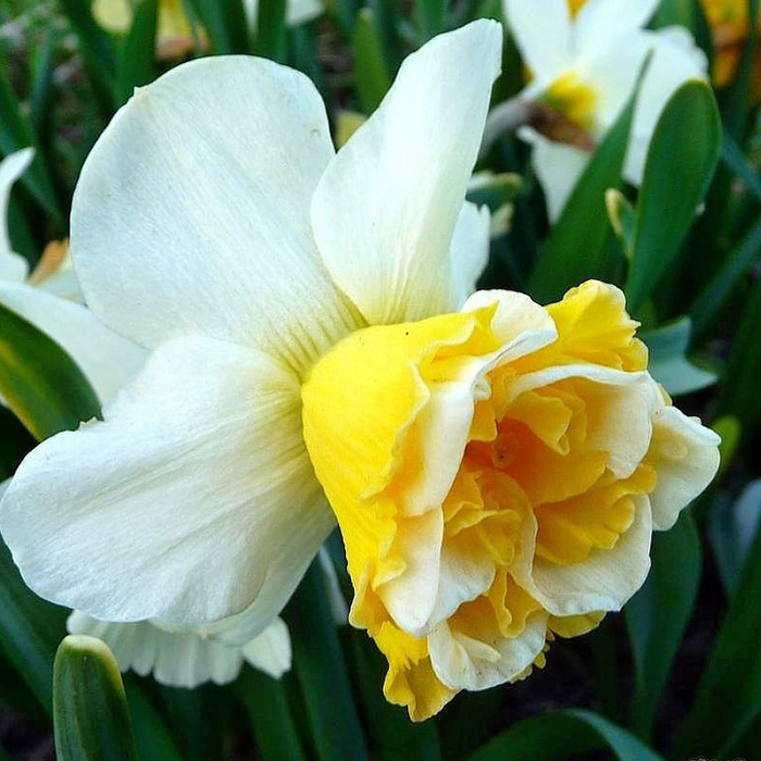 Нарцисс махровый вейв - это изысканное растение с белыми цветками и желто-белой коронкой, которое поражает своей красотой и изяществом. Этот сорт нарцисса van-sion отличается высотой до 35 см и цветет в мае и апреле, радуя глаз своими нежными лепестками. Листья зеленые, что создает прекрасный контраст с белоснежными цветами. Растение предпочитает солнечные и полутенистые места, идеально подходит для групповых посадок и каменистых горок.