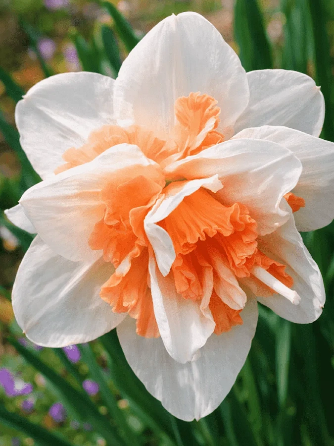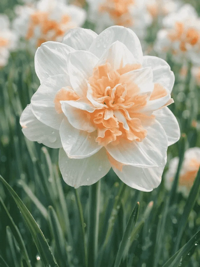 Окраска цветка : белая, персиково-розовая корона