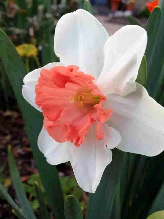 Окраска цветка : белая, коронка желтая, розовая