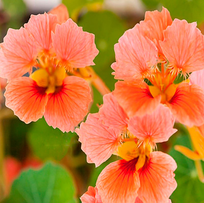 Настурция низкорослая "Везувий" - это удивительное растение с розово-лососевыми цветками, которое порадует вас своим великолепием в течение всего лета. Ее стебель нежный и изящный, а размеры компактные, что делает ее идеальным выбором для групповых посадок в вашем саду. Листья настурции имеют интересную форму и яркую зеленую окраску, что придает растению особый шарм.
